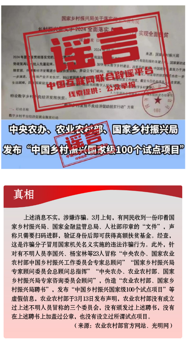 假冒權(quán)威杜撰政策類謠言,誤導(dǎo)公眾。3月以來,一些不法分子或機(jī)構(gòu)打著權(quán)威旗號,假冒國家機(jī)關(guān)、偽造政府公文、歪曲解讀政策,企圖行騙牟利。如,詐騙分子冒用國家機(jī)關(guān)名義,假稱“國家發(fā)放2024年鄉(xiāng)村振興扶貧補(bǔ)貼”“鄉(xiāng)村振興項目有國家級試點100個”“‘退稅綠色通道’加快退稅到賬速度”等,實施違法詐騙行為,給社會公眾造成極大信息和資金安全風(fēng)險。還有人制造、傳播“我國城鄉(xiāng)居民醫(yī)保參保人數(shù)近年來持續(xù)下降,部分地區(qū)農(nóng)村出現(xiàn)醫(yī)保退保潮”“失業(yè)保險金只能領(lǐng)一次,最多領(lǐng)24個月”“我國社保基金全都交給外資機(jī)構(gòu)管理”等一系列與事實嚴(yán)重不符的涉公共謠言,迷惑性大、蠱惑性強(qiáng),極易誤導(dǎo)公眾,對我國現(xiàn)有社保政策和相關(guān)工作造成負(fù)面影響。