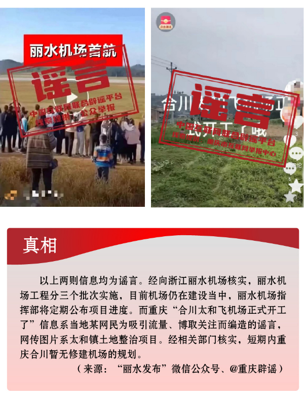 搭蹭熱點散播民生類謠言,渲染焦慮。3月,全國兩會召開,“民生清單”熱度高?!按赫小薄按河巍钡葧r間節(jié)點,有關(guān)招工就業(yè)、疫病傳染等內(nèi)容也成為個別網(wǎng)民博眼球的素材。一些個人或自媒體歪曲甚或虛構(gòu)事實,編造散布社會民生謠言,引發(fā)公眾不必要的焦慮。如,別有用心者惡意虛構(gòu)事實,發(fā)布“重慶80%的工廠暫停招聘”“湖南郴州疫情卷土重來”等虛假信息,渲染負(fù)面情緒、徒增公眾憂慮、擾亂社會秩序;還有人為吸引流量、博取關(guān)注,根據(jù)主觀臆想,采取移花接木等手段,散播“京滬高速公路停止收費”“浙江麗水機(jī)場已建成投用并首航”“重慶合川太和飛機(jī)場正式開建”等涉重大基礎(chǔ)設(shè)施建設(shè)項目的假消息,誤導(dǎo)公眾認(rèn)知,擾亂群眾交通出行秩序。