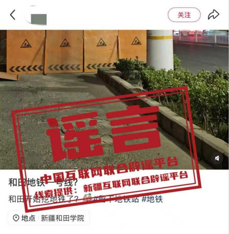 真相:近日,有網(wǎng)民發(fā)布消息稱“新疆和田要建地鐵一號線?開始挖地鐵了?”,并配以道路施工圖片,引發(fā)關(guān)注。經(jīng)和田市交通運輸局核實,網(wǎng)傳信息系謠言,截至目前,未收到任何關(guān)于和田市開挖地鐵的工作通知或確認信息。(來源:“新疆網(wǎng)絡(luò)辟謠”微信公眾號)