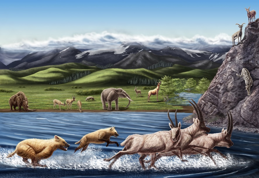 西藏札達(dá)盆地上新世哺乳動(dòng)物群生態(tài)復(fù)原圖。(中國科學(xué)院古脊椎所供圖)