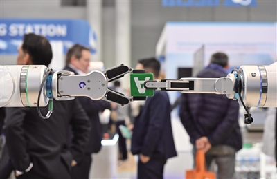 在近日舉行的2024年德國漢諾威工業(yè)博覽會上,人工智能成為重點關(guān)注的領(lǐng)域之一。圖為會上一款機器人在演示傳遞物品。新華社記者 任鵬飛 攝