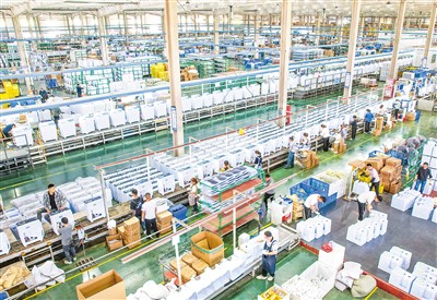 4月25日,在江蘇省宿遷市蘇宿工業(yè)園區(qū)的江蘇皓峰電器有限公司生產(chǎn)車間內(nèi),技術人員在生產(chǎn)加工銷往海內(nèi)外市場的智能洗衣機。陳少帥攝(人民視覺)