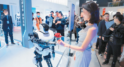 3月14日,在上海市舉辦的中國家電及消費電子博覽會上,海爾公司的AI人形家庭機器人現(xiàn)場向人們贈送玫瑰。陳玉宇攝(人民視覺)