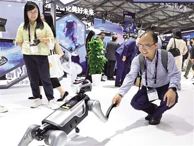 6月18日,觀眾在2025年世界移動通信大會(上海)中國電信展臺與智能機器狗互動。 記者 陳愛平 攝