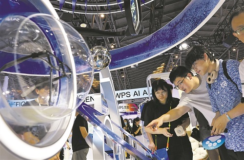參觀者在2025世界人工智能大會現(xiàn)場的一個(gè)智能眼鏡展臺前交流討論。新華社記者 方喆攝
