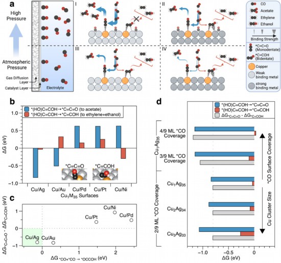 圖為該論文的理論計(jì)算,表明銅-銀稀釋合金催化劑表面更利于單齒型吸附的*C=C=O二碳基團(tuán)的生成,及其需要更高的CO表面覆蓋度以保證碳-碳偶聯(lián)的高效發(fā)生。