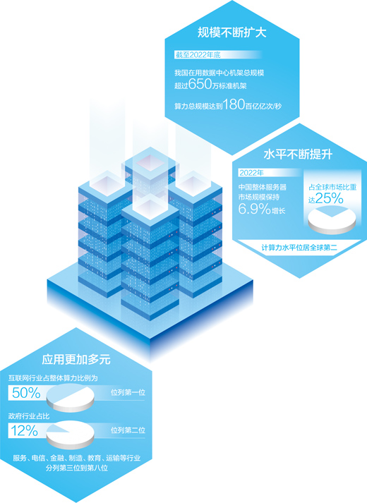 《2022—2023全球計(jì)算力指數(shù)評(píng)估報(bào)告》顯示,2022年,中國整體服務(wù)器市場規(guī)模保持6.9%的正增長,占全球市場比重達(dá)25%,計(jì)算力水平位居全球第二。近年來,我國算力產(chǎn)業(yè)蓬勃發(fā)展,融合應(yīng)用深度不斷拓展。算力作為數(shù)字經(jīng)濟(jì)時(shí)代的關(guān)鍵生產(chǎn)力,有效賦能千行百業(yè)數(shù)字化轉(zhuǎn)型,推動(dòng)新興產(chǎn)業(yè)發(fā)展。