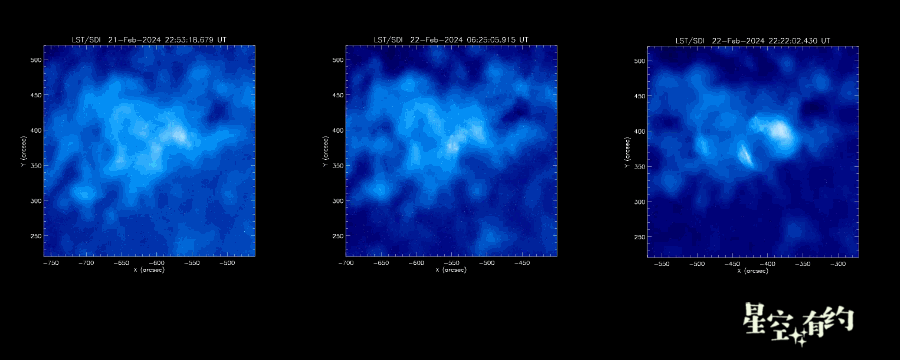最近3個X級耀斑(22日X1.8級耀斑、22日X1.7級耀斑和23日X6.3級耀斑)發(fā)生時“夸父一號”太陽全日面成像儀拍攝到的影像。(“夸父一號”研究團隊供圖)