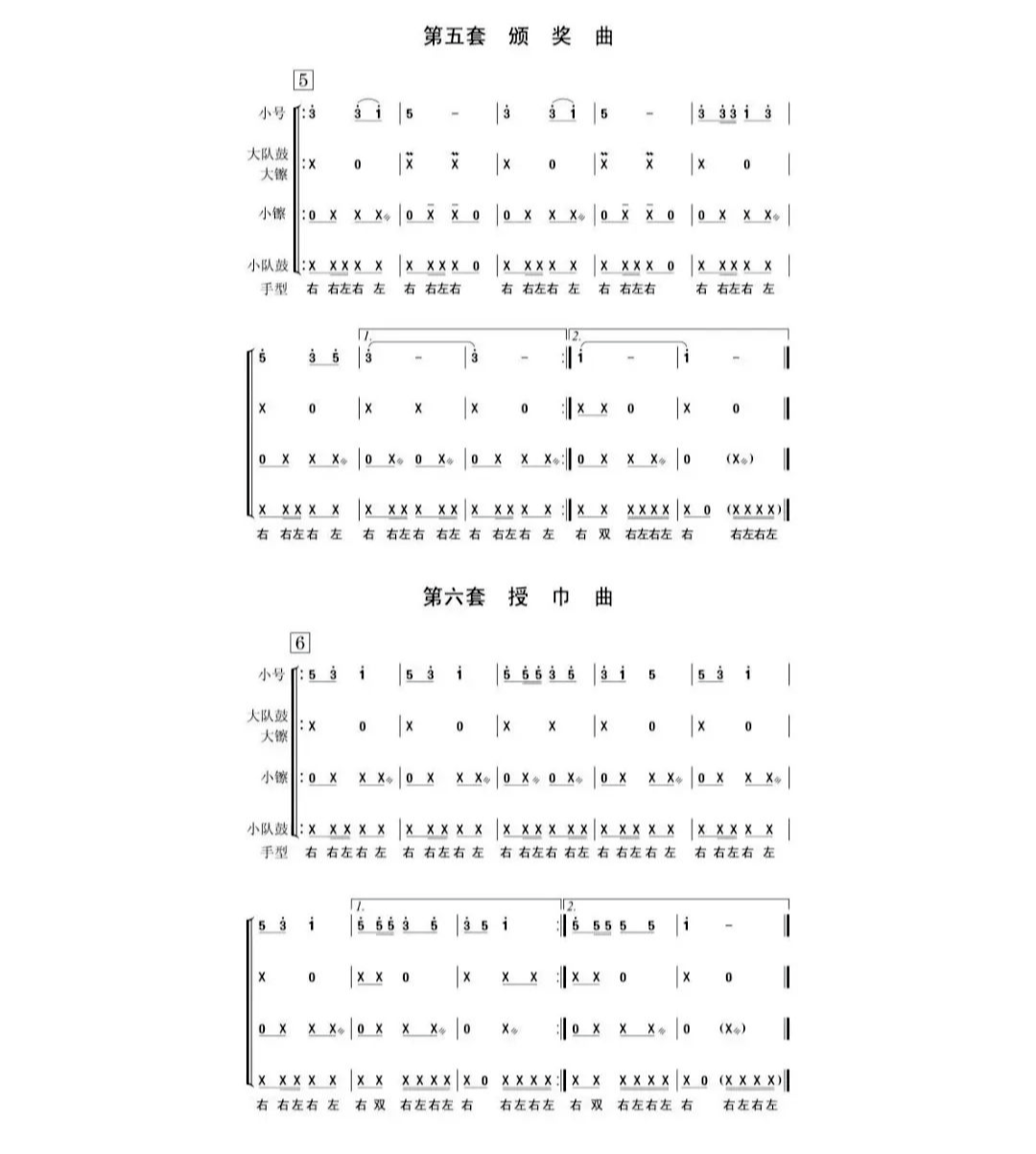 少先隊鼓號隊總譜除間奏鼓外共10套曲目,包括:開場曲、進行曲、出旗曲、退旗曲、頒獎曲、授巾曲、檢閱曲、宣誓曲、迎賓曲、歡送曲。