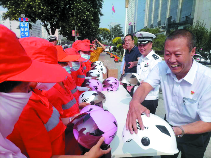 今年是我市創(chuàng)建全國文明城市的決戰(zhàn)決勝年,廣大環(huán)衛(wèi)工人一直默默奮斗在崗位上,為我市創(chuàng)文不斷努力。市公安局交警支隊(duì)始終牽掛著奮戰(zhàn)在基層一線的環(huán)衛(wèi)工人,支隊(duì)以此次贈(zèng)送頭盔活動(dòng)為契機(jī),持續(xù)關(guān)心關(guān)愛環(huán)衛(wèi)工人的生命安全和身體健康。市公安局交警支隊(duì)負(fù)責(zé)人表示:“環(huán)衛(wèi)工人大多騎著電動(dòng)三輪車或人力保潔車穿梭在大街小巷,機(jī)動(dòng)車道是他們的主要作業(yè)區(qū)之一,佩戴安全頭盔,可以大大增加他們的安全系數(shù)。同時(shí),環(huán)衛(wèi)等重點(diǎn)行業(yè)的示范引領(lǐng)作用,將有力帶動(dòng)市民遵紀(jì)守法、安全出行,為文明城市創(chuàng)建打造一道亮麗的風(fēng)景線?!眻D為捐贈(zèng)活動(dòng)現(xiàn)場(chǎng)。張志遠(yuǎn) 攝影報(bào)道