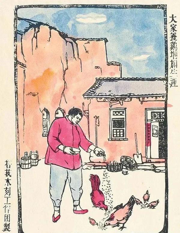 魯藝木刻工作團(tuán)制作的新年畫《大家養(yǎng)雞增加生產(chǎn)》。新華社發(fā)(延安魯藝文化中心供圖)