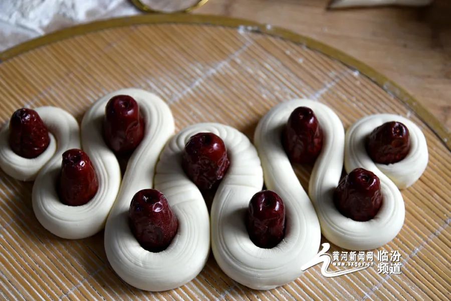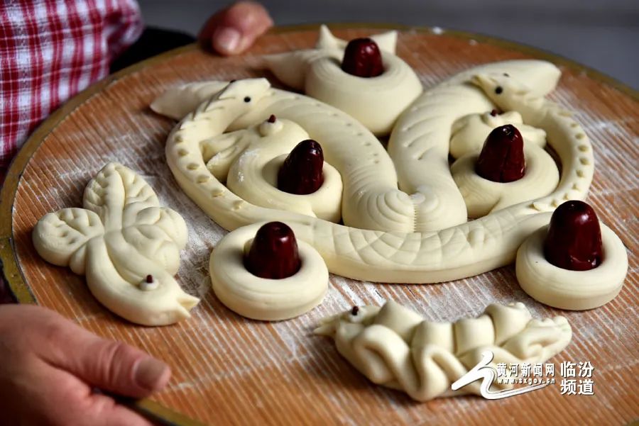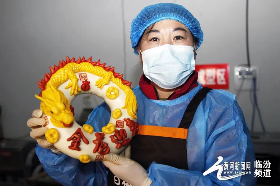 在晉南,蒸花饃是不可缺少的一項年俗?;x藝人用面粉、果蔬汁、雞蛋和牛奶等食材為原料,巧手捏制出“金龍迎春”“迎春納?!钡仍⒁饧榈南盗谢x,為即將到來的龍年春節(jié)增添了濃濃的年味。