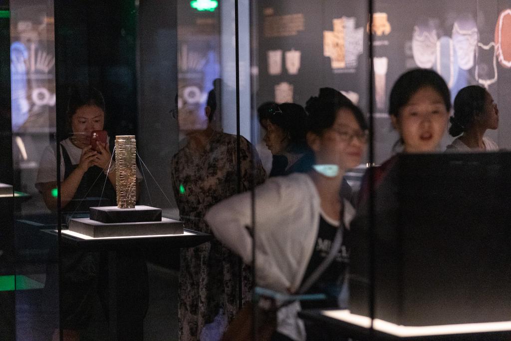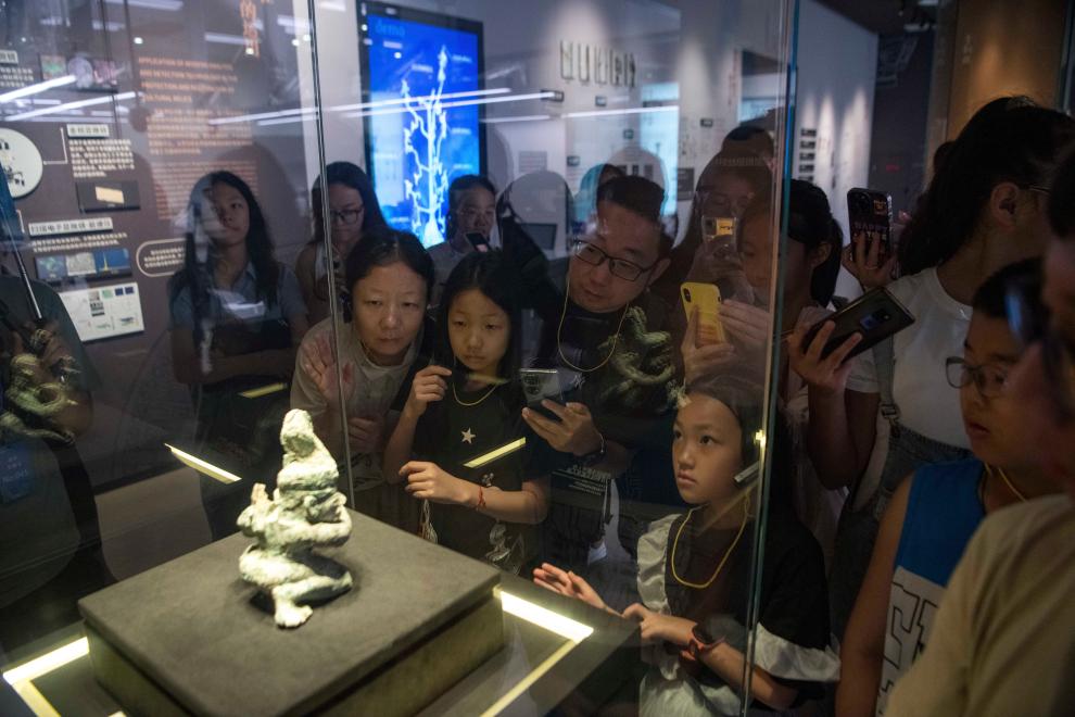 在四川廣漢三星堆博物館文物保護與修復館,游客在“匠心妙手——三星堆遺址新出土文物保護修復成果展示”試開放期參觀(7月22日攝)。新華社記者 唐文豪 攝