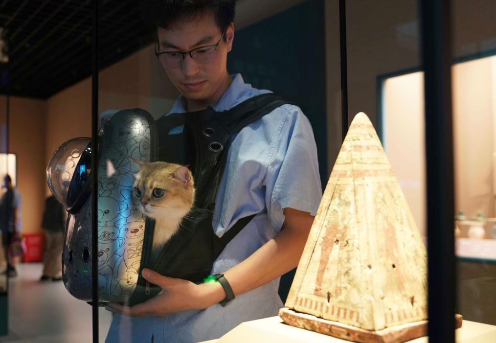 7月27日,寵物貓與主人在上海博物館“金字塔之巔:古埃及文明大展”“薩卡拉的秘密”展區(qū)內觀展。新華社發(fā)(陳浩明攝)