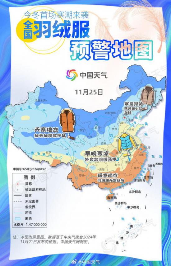 從以往的數(shù)據(jù)統(tǒng)計來看,寒潮最多發(fā)的月份是在11月,其次就是10月份和3月份。之所以是在冬春交替還有秋冬交替的時節(jié),寒潮比較多發(fā),其實也是因為這段時間容易出現(xiàn)實力比較強的冷空氣,而且前期基礎(chǔ)氣溫相對比較高,所以容易出現(xiàn)大幅度的降溫,從而達到寒潮的標(biāo)準(zhǔn)。隆冬時節(jié)因為基礎(chǔ)氣溫已經(jīng)比較低了,所以即使有很強的冷空氣,氣溫的下降幅度可能也比較有限。 目前正在影響我國的這次寒潮過程,其實也是出現(xiàn)在常年寒潮最頻繁、最多發(fā)的月份。 從南到北都要穿:全國羽絨服預(yù)警地圖出爐 寒潮來襲,不僅要為供水用水設(shè)施和交通設(shè)施“添衣保暖”,不同地區(qū)的人們也要特別注意穿衣保暖了。 “寒潮來襲別???,不穿羽絨扛不住?!泵鎸@波寒潮,您家里的終極保暖裝備羽絨服必須出場了。我們也通過這張全國羽絨服預(yù)警地圖,來看看您需要加長加厚款的羽絨服,還是防風(fēng)短小款的羽絨服。