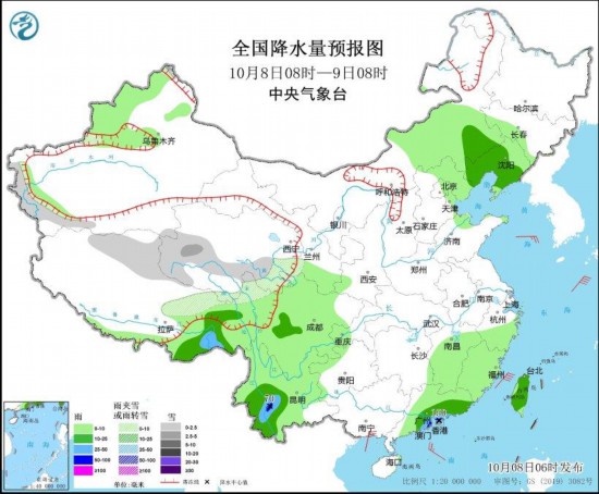 圖1 全國降水量預報圖(10月8日08時-9日08時)