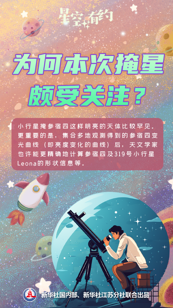 太陽(yáng)系的行星、小行星等在移動(dòng)時(shí),時(shí)常會(huì)掩住遠(yuǎn)處的恒星。不過(guò),小行星掩參宿四這樣明亮的天體比較罕見?!皯{肉眼看到參宿四明顯變暗或‘消失’,將會(huì)是一次難得的體驗(yàn)。”王科超介紹說(shuō),此次掩星不僅有觀賞性,還具有科學(xué)價(jià)值。集合多地觀測(cè)得到的參宿四變光曲線(即亮度變化的曲線)后,天文學(xué)家也許能更精確地計(jì)算參宿四及319號(hào)小行星Leona的形狀信息等。