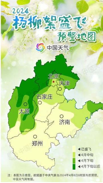 以華北地區(qū)最早開始飄絮的白毛楊為例,當(dāng)日平均氣溫大于0℃時,白毛楊才能正常生長發(fā)育,將這些超過0℃的數(shù)值累加起來,當(dāng)總和達(dá)到480℃,且日平均氣溫達(dá)到14℃,楊絮就開始飄飛。華北一帶,往往4月上旬前后達(dá)到這一標(biāo)準(zhǔn)。楊絮飄飛10余天后,柳絮也會進(jìn)入飄飛期。