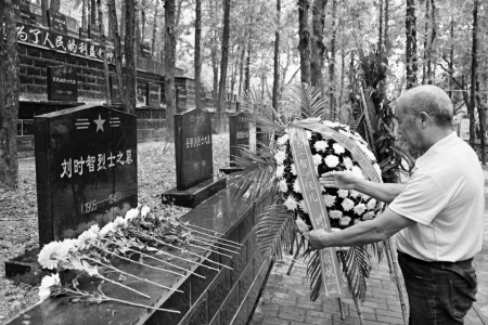 長(zhǎng)子獨(dú)立團(tuán)團(tuán)長(zhǎng)劉時(shí)智烈士的墓碑前,來(lái)自湖北省紅安縣華河鎮(zhèn)大學(xué)村的劉正業(yè)捧著從家鄉(xiāng)帶來(lái)的水和土,淚流滿面,反復(fù)說(shuō)著“侄子不孝,現(xiàn)在才找到您,這么晚才來(lái)看您?!?/p>