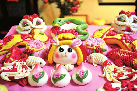“生肖青蛇臥盤,雙春蛇年生機盎然;醒獅賀歲,歲歲平安;花開富貴葫蘆,福祿到家;可愛的醒獅兔,蛇盤兔代代富;平安扣青枝上盛開梅花,寓意花開富貴、孕育希望、生機盎然;可愛福袋,寓意代代有福、福氣滿滿;大紅錦鯉寓意好運連連……”馮秀說,今年的花饃圍繞“金蛇送?!边@一主題,設計了近20個品種,每款花饃都寓意吉祥和美好祝福。每一款非遺花饃的創(chuàng)意都是基于傳統(tǒng)文化,都是對傳統(tǒng)文化的致敬,也是人們對美好生活的期待和向往,“過年買花饃是吃在嘴里的年味兒,充滿了幸福感,我的花饃顧客來自全國各地,有的連續(xù)多年定制,成為了老朋友?!?/p>