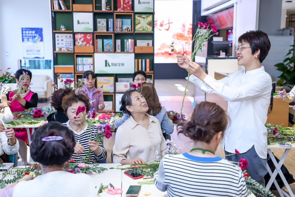 在國家老年大學魏公村校區(qū)課堂上,老師黃山正在講授插花課程。(國家老年大學供圖)