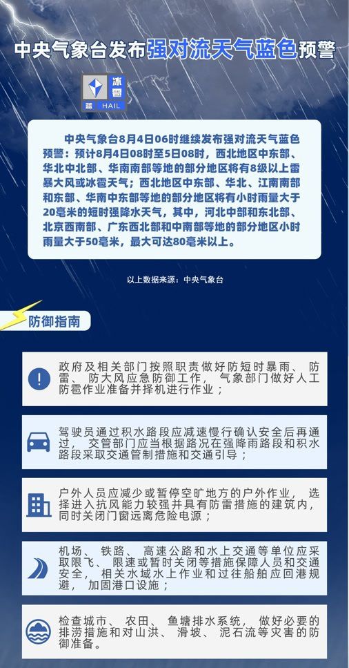 8月4日6時,中央氣象臺發(fā)布暴雨橙色、高溫橙色、強對流藍色三預警: