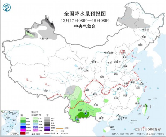 12月17日08時至18日08時,內(nèi)蒙古東北部、黑龍江西南部、新疆北部、川西高原南部等地部分地區(qū)有小到中雪或雨夾雪,其中,新疆阿勒泰地區(qū)和伊犁河谷局地有大到暴雪(10~16毫米)。西南地區(qū)南部、湖南西部、福建東北部、廣西西北部、海南島西南部等地部分地區(qū)有小到中雨,其中,云南東南部局地有大雨(25~35毫米)。西藏中北部等地部分地區(qū)有4~6級風;東海南部海域、臺灣海峽、巴士海峽、南海東北部和中東部海域將有5~7級大風、陣風8級。