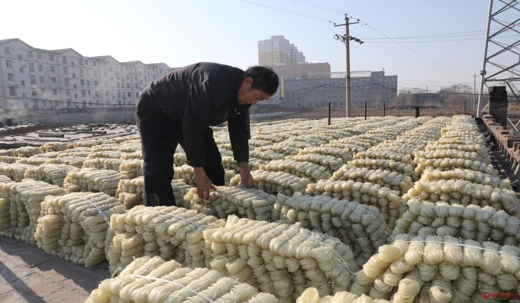 12月23日,原平市新原鄉(xiāng)班村老賈粉條加工廠內(nèi),老賈正在打捆制作好的粉條。老賈加工粉條已有30多個(gè)年頭,生產(chǎn)的傳統(tǒng)手藝無添加劑綠色粉條,很受市民青睞,不僅占領(lǐng)了本地市場,還遠(yuǎn)銷大同、包頭,產(chǎn)品供不應(yīng)求。 (褚 震 攝)