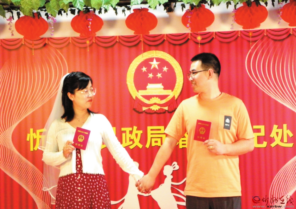 在頒證儀式上,登記員帶領(lǐng)新人宣讀結(jié)婚誓言。忻州市婦聯(lián)、市民政局相關(guān)領(lǐng)導(dǎo)為新人送上溫馨祝福。在忻府區(qū)民政局婚姻登記服務(wù)中心,新人們臉上洋溢著幸福的笑容,來到婚姻登記窗口依次辦理結(jié)婚手續(xù)。