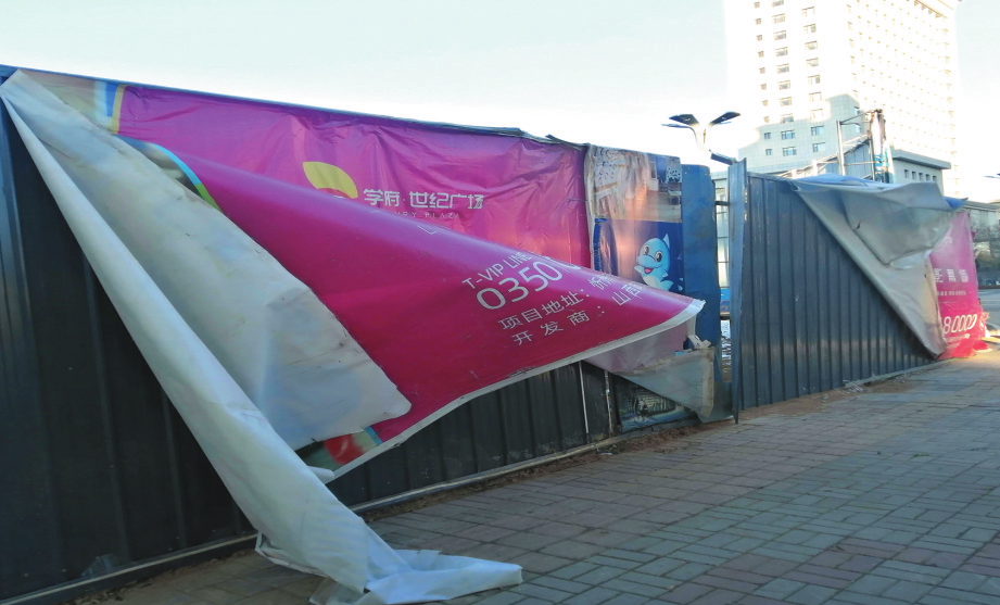 近日,受大風(fēng)影響我市城區(qū)幾處廣告牌被刮損,有的甚至有墜落危險,希望相關(guān)部門采取措施及時修復(fù),也提醒廣大市民如遇大風(fēng)天氣,應(yīng)盡量減少外出,出門時要盡量遠(yuǎn)離高層建筑物和廣告牌。(記者 李 濤 攝影報道)