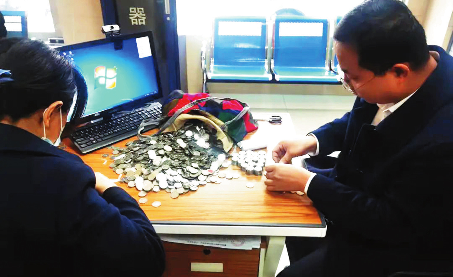 坐在柜臺前的老大爺打開了里一層、外一層的帆布包,里面都是一元硬幣。大爺告訴工作人員,這是他每天攢一枚,共攢了九年時間的硬幣,現(xiàn)在歲數(shù)大了,想一次性兌換成紙幣另作他用。
