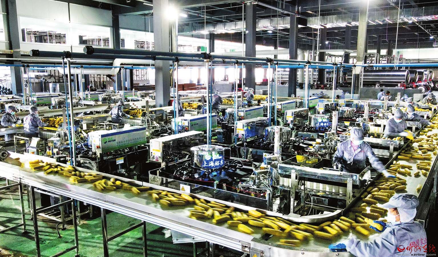 總占地面積約100畝的五寨縣甜糯玉米產(chǎn)業(yè)園,坐落于五寨縣的國家農(nóng)村產(chǎn)業(yè)融合發(fā)展示范園。園內(nèi)采用國內(nèi)先進的生產(chǎn)工藝,從機器去皮、切梗去尖、巴氏滅菌、真空包裝到速凍隧道、智能庫房等,實現(xiàn)去皮、切頭、清洗、分級、殺菌、蒸煮、包裝的全流程機械化自動化,極大地提高了加工效率,每小時可加工甜糯玉米27萬穗,最大限度保留了玉米的色、香、味和營養(yǎng)成分。