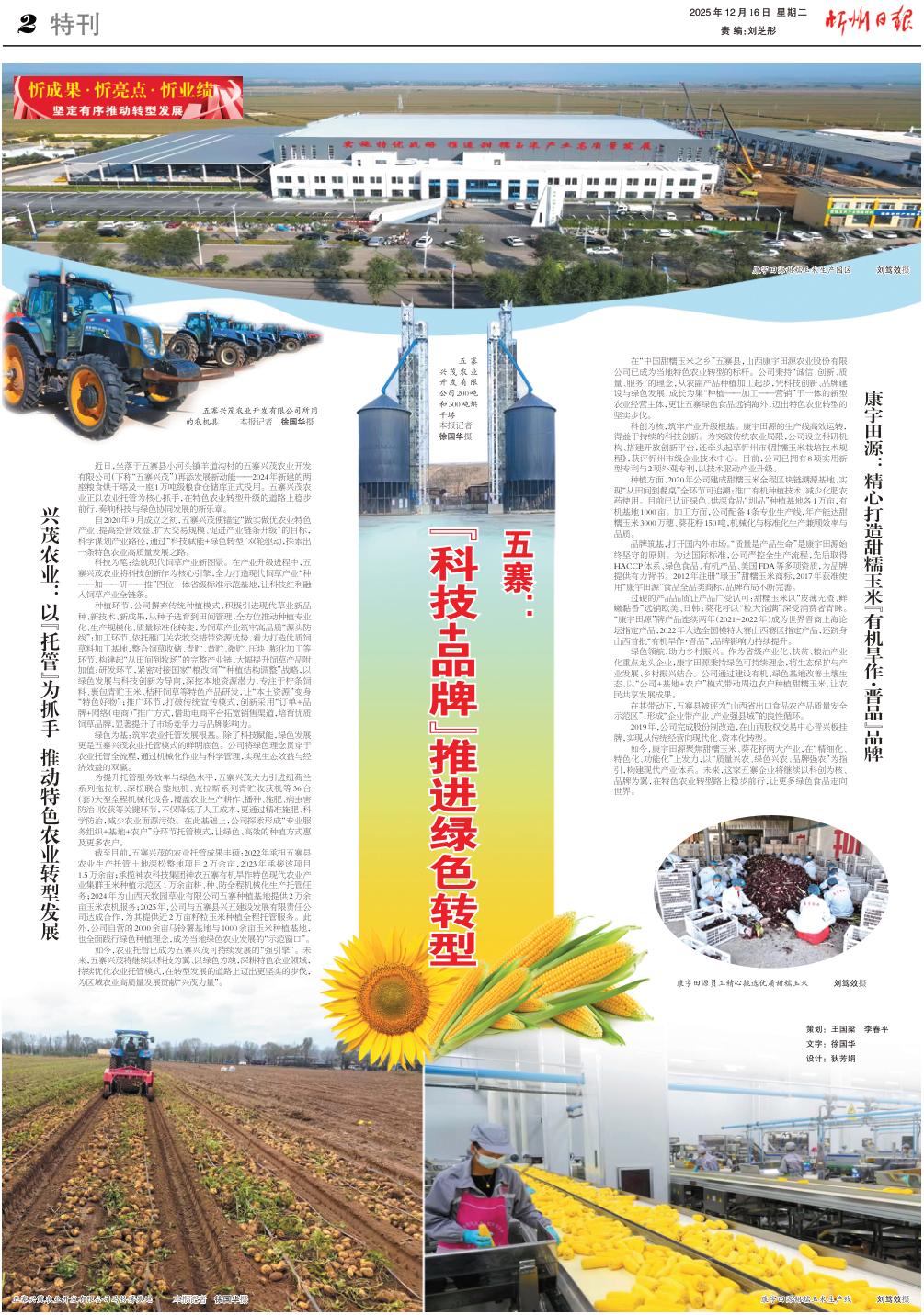 在“中國甜糯玉米之鄉(xiāng)”五寨縣,山西康宇田源農(nóng)業(yè)股份有限公司已成為當(dāng)?shù)靥厣r(nóng)業(yè)轉(zhuǎn)型的標(biāo)桿。公司秉持“誠信、創(chuàng)新、質(zhì)量、服務(wù)”的理念,從農(nóng)副產(chǎn)品種植加工起步,憑科技創(chuàng)新、品牌建設(shè)與綠色發(fā)展,成長為集“種植——加工——營銷”于一體的新型農(nóng)業(yè)經(jīng)營主體,更讓五寨綠色食品遠(yuǎn)銷海外,邁出特色農(nóng)業(yè)轉(zhuǎn)型的堅實步伐。