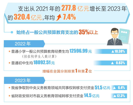 在推動(dòng)城鄉(xiāng)教育一體化發(fā)展方面,省財(cái)政持續(xù)提高義務(wù)教育學(xué)校公用經(jīng)費(fèi)基準(zhǔn)定額。從2023年春季學(xué)期起,小學(xué)由生均650元/年提高到720元/年,初中由生均850元/年提高到940元/年。同時(shí),2023年中央和省級(jí)財(cái)政安排10.53億元,支持改善農(nóng)村義務(wù)教育學(xué)?;巨k學(xué)條件,有序擴(kuò)大城鎮(zhèn)學(xué)位供給。