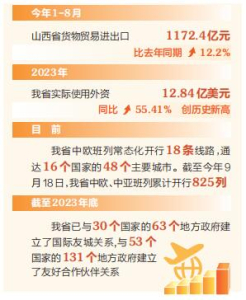 牢記殷殷囑托,奏響開放強(qiáng)音。當(dāng)前,全省上下牢記習(xí)近平總書記殷殷囑托,堅定不移推進(jìn)更高水平對外開放,著力優(yōu)化開放布局、推進(jìn)制度型開放、促進(jìn)對外貿(mào)易擴(kuò)量提質(zhì)、提升開放平臺能級、建設(shè)開放通道、提升投資貿(mào)易便利化、加強(qiáng)開放創(chuàng)新能力合作,加快構(gòu)建起多元發(fā)展、多點(diǎn)支撐的全面開放新格局,作為內(nèi)陸省份,山西對外開放的力度越來越大。