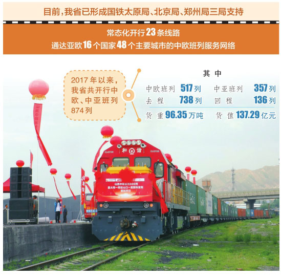 2月26日,陽泉至烏茲別克斯坦塔什干的中亞班列以及白俄羅斯明斯克至陽泉的中歐班列順利開通,填補(bǔ)了國鐵北京局集團(tuán)管內(nèi)山西中歐班列開行的空白;3月28日,太原市皇后園至俄羅斯莫斯科的中歐班列開行,實(shí)現(xiàn)了太原市中歐班列開行零的突破;4月26日,我省到西班牙巴塞羅那的首列中歐班列順利抵達(dá);6月26日,首發(fā)大同經(jīng)阿拉山口至莫斯科的中歐班列;8月30日,革命老區(qū)呂梁至莫斯科的中歐班列在文水首發(fā);12月6日,聯(lián)合長治市政府、國鐵鄭州局集團(tuán)舉行了由長治北經(jīng)阿拉山口至莫斯科的首發(fā)儀式。