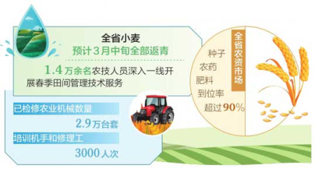 全省農(nóng)資市場(chǎng)備貨充足,價(jià)格穩(wěn)中有降。目前,種子、農(nóng)藥、肥料到位率超過(guò)90%。全省已檢修農(nóng)業(yè)機(jī)械數(shù)量2.9萬(wàn)臺(tái)套,培訓(xùn)機(jī)手和修理工3000人次。