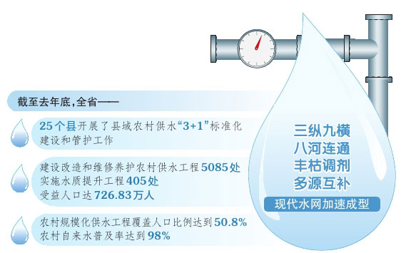截至去年底,全省25個(gè)縣開展了縣域農(nóng)村供水“3+1”標(biāo)準(zhǔn)化建設(shè)和管護(hù)工作;建設(shè)改造和維修養(yǎng)護(hù)農(nóng)村供水工程5085處,實(shí)施水質(zhì)提升工程405處,受益人口達(dá)726.83萬人;農(nóng)村規(guī)?;┧こ谈采w人口比例達(dá)到50.8%,農(nóng)村自來水普及率達(dá)到98%。