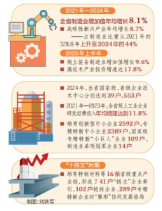統(tǒng)計(jì)數(shù)據(jù)顯示,2021年—2024年,全省制造業(yè)增加值年均增長8.1%,戰(zhàn)略性新興產(chǎn)業(yè)年均增長8.7%,占制造業(yè)比重從2021年的32%逐年上升至2024年的44%。2025年上半年全省規(guī)上裝備制造業(yè)增加值增長9.6%,高技術(shù)產(chǎn)業(yè)投資增速達(dá)17.8%,戰(zhàn)略性新興產(chǎn)業(yè)對(duì)工業(yè)增長貢獻(xiàn)率日漸提高。