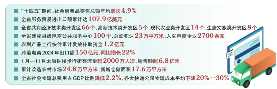 數(shù)字顯示,“十四五”期間,社會(huì)消費(fèi)品零售總額年均增長(zhǎng)4.9%,建成100個(gè)鄉(xiāng)村e(cuò)鎮(zhèn),打造了大同黃花等113個(gè)區(qū)域公用品牌。農(nóng)產(chǎn)品上行快件補(bǔ)助帶動(dòng)約33億元農(nóng)產(chǎn)品銷售。實(shí)物商品網(wǎng)上零售額年均增長(zhǎng)24.1%,高于全國(guó)17.1個(gè)百分點(diǎn)。