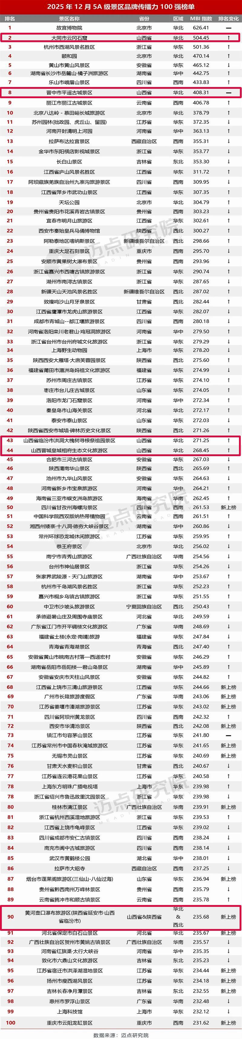 邁點(diǎn)研究院1月16日發(fā)布“2025年12月5A級景區(qū)品牌傳播力100強(qiáng)榜單”,山西省5家景區(qū)榜上有名,分別是云岡石窟、平遙古城、洪洞大槐樹、皇城相府、壺口瀑布景區(qū),其中壺口瀑布景區(qū)為新上榜。