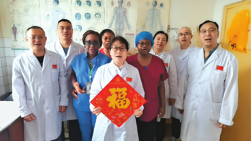 中國(guó)(山西)第25批援喀麥隆醫(yī)療隊(duì)隊(duì)員與受援國(guó)醫(yī)院同事共慶中國(guó)新春佳節(jié)。張麗利攝