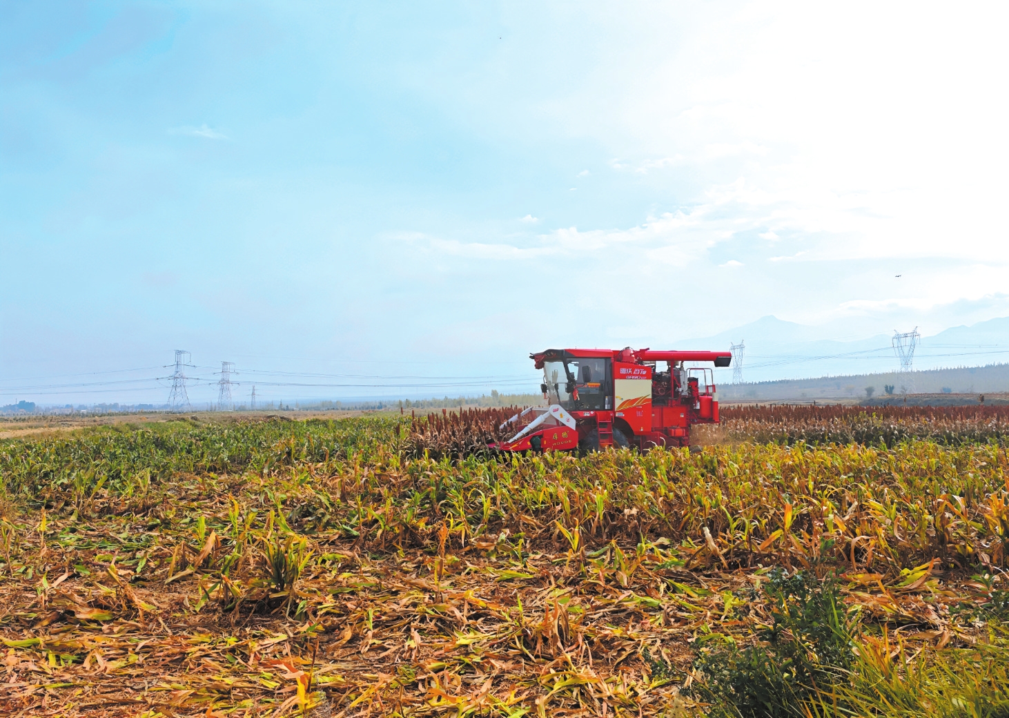 圖為村民正操作農(nóng)機(jī)收獲高粱。本報(bào)記者 趙丹琦攝