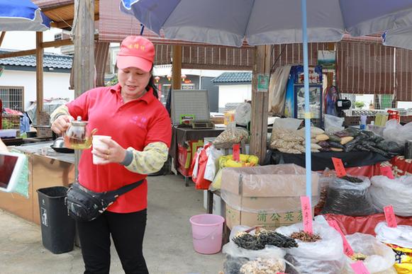 “天太熱,來(lái)喝口我這免費(fèi)的茶?!辈湃脒B樟村村口,記者便被熱情的村民陸秀媚招呼到了自己的攤位。紅茶、本地枝葉、山柑皮、筍干……她的攤位琳瑯滿目,擺得滿滿當(dāng)當(dāng)。陸秀媚告訴記者,自己曾經(jīng)在市里賣童裝,剛開始還能掙到些錢,后來(lái)隨著網(wǎng)購(gòu)興起,實(shí)體店的生意越來(lái)越難做。2018年,在習(xí)近平總書記來(lái)連樟村視察后,看到家鄉(xiāng)越變?cè)胶?,陸秀媚選擇了回到村里創(chuàng)業(yè)。