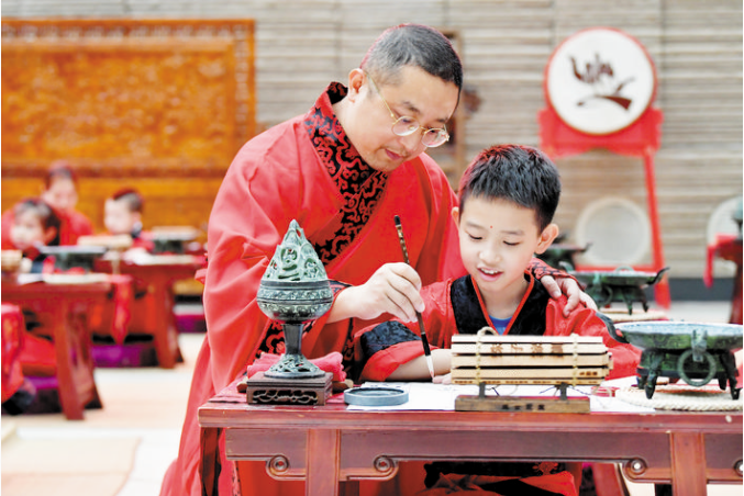 9月13日,一場漢服“開筆禮”在西安大唐西市博物館舉行,多名孩童著漢服,行漢禮,通過“朱砂開智”“啟蒙描紅”等環(huán)節(jié)體驗(yàn)中國傳統(tǒng)文化。圖為家長帶領(lǐng)孩子一起進(jìn)行“啟蒙描紅”。 新華社記者 劉瀟 攝