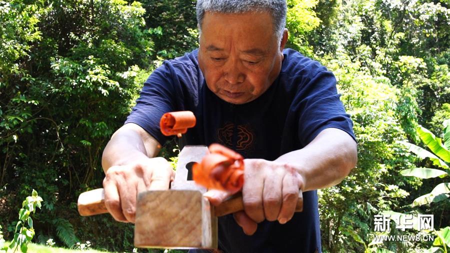 王德文在廣西梧州市蒙山縣陳塘鎮(zhèn)刨木料(7月23日攝)。新華社記者 吳思思 攝