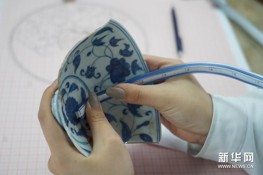 修復師何奕慧在測量一件瓷器,將三維瓷器上的圖案還原到二維的紙面上,必須要經(jīng)過仔細的測量(12月3日攝)。新華社記者 周密 攝