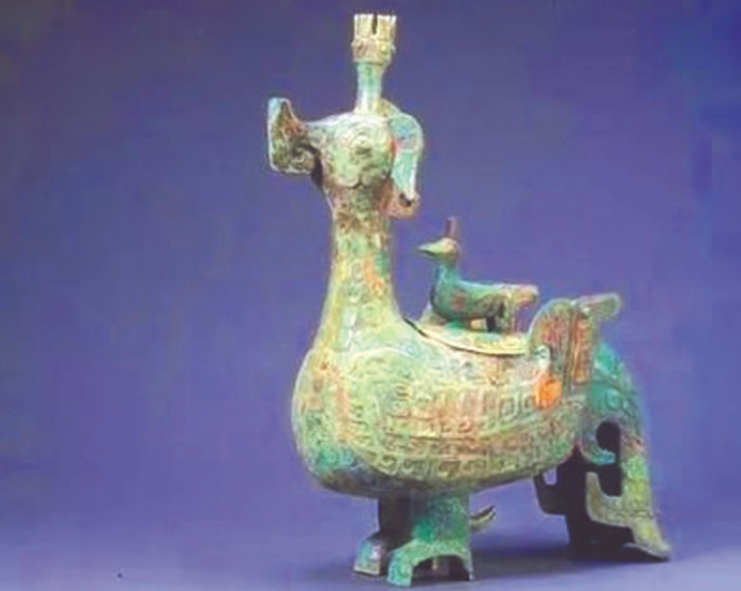 第二件是北京保利藝術(shù)博物館從海外購回、2004年曾名噪一時的“倗季鳳鳥尊”。它也是一只昂首挺立的鳳鳥形象,鳳鳥背部挺立一只小鳥。蓋內(nèi)側(cè)有銘文“倗季乍祖考寶彝”。2005年“中國十大考古新發(fā)現(xiàn)”山西絳縣橫水墓地的發(fā)掘和研究,證實了古倗國就在山西南部。那么,“倗季鳳鳥尊”的出土地也應(yīng)該是山西無疑了。