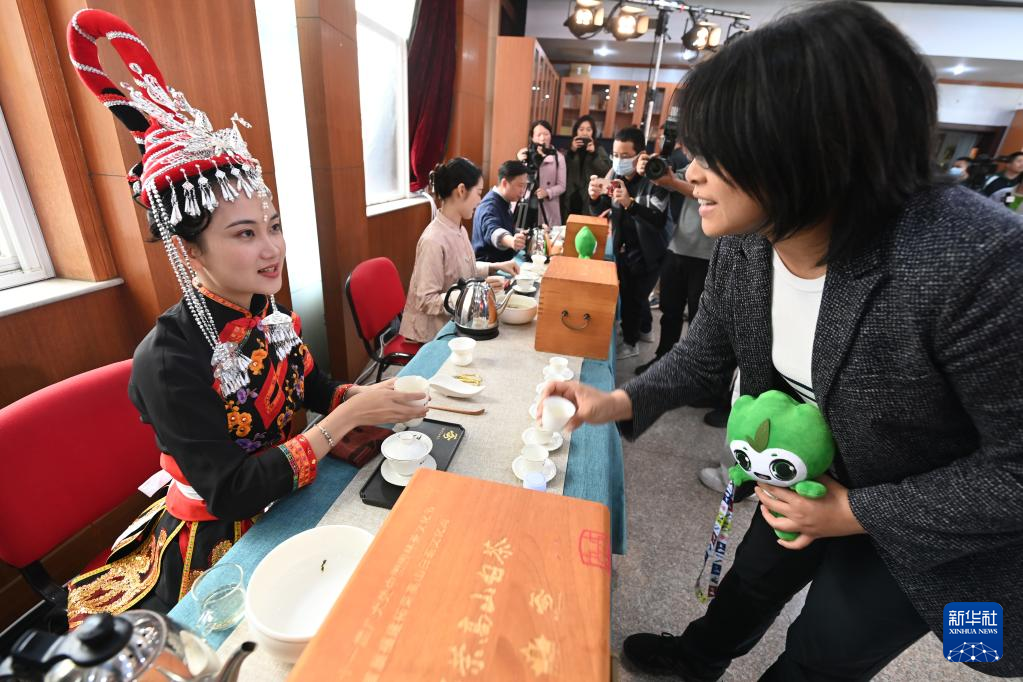當日,第二十二屆八大處中國園林茶文化節(jié)暨首屆福建柘榮高山白茶文化周在北京舉行新聞發(fā)布會。據(jù)介紹,該活動將于4月28日至5月3日在北京八大處公園舉行。期間,福建省柘榮縣多家茶企業(yè)將在八大處公園內(nèi)設臺擺桌,沏茶迎客,供游客品嘗高山白茶,感受白茶特有文化。(新華社記者 李俊東 攝)