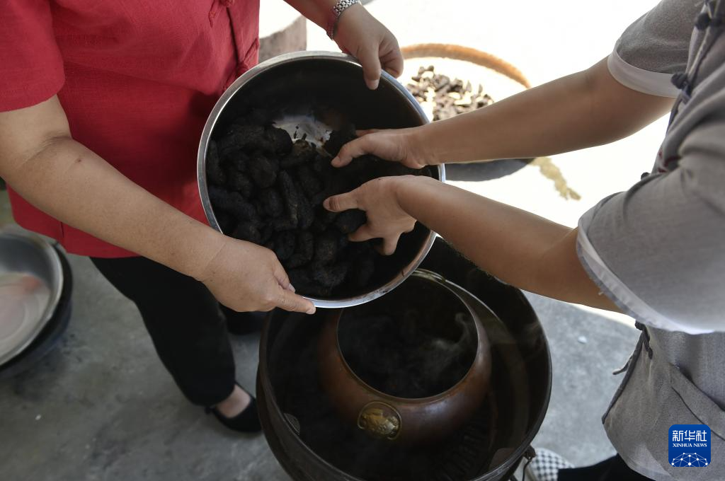 8月4日,在禹州中醫(yī)藥文化技藝傳習(xí)館,非遺項(xiàng)目“禹州中藥加工炮制技藝”代表性傳承人朱改蓮(右)展示中藥材“九蒸九曬”加工技藝。